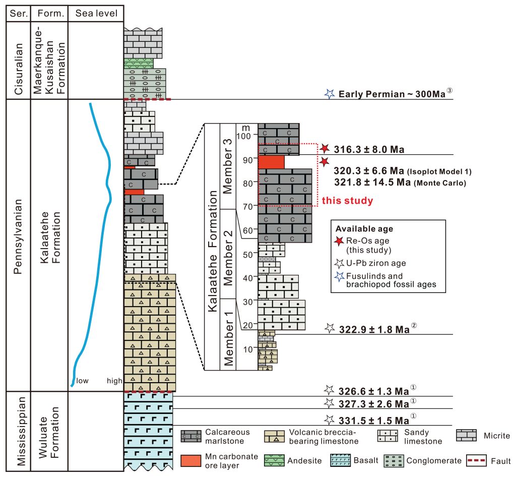 2  石炭系奥尔托喀讷什锰矿沉积序列剖面图。红星代表的年龄数据分别来自含有机质泥灰岩和碳酸锰矿石的Re-Os年龄(见图1