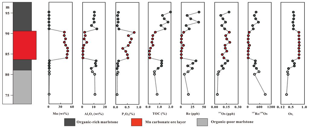 沉积型碳酸锰矿床中的锰碳酸盐矿物通常被认为是原生锰氧化(MnO2)与有机质共同埋藏后经过成岩作用转化而成,支持这一认识的主要证据有锰氧化物被锰碳酸盐矿物交代的岩相学现象,锰碳酸盐矿物极负的碳同位素值以及矿石全岩样品与现代铁锰结核类似的稀土元素配分形式。然而,作为全球锰资源最为重要的矿床类型,沉积型碳酸锰矿床的直接定年一直是学术界的难题,究其原因主要是这类矿床通常赋存于沉积岩序列中且缺乏可直接定年的矿物。如前所述,有机质的埋藏是锰碳酸盐成岩转化的重要前提,而富有机质沉积岩本身又是开展Re-Os定年的理想对象,这两点均为直接对碳酸锰矿石开展Re-Os年代学定年提供了可能。同时,原生锰氧化物沉积时还会捕获海水的Os同位素信息,如果这一信息在成岩过程中能够得以保存,可进一步为约束古海洋Os同位素组成提供依据。