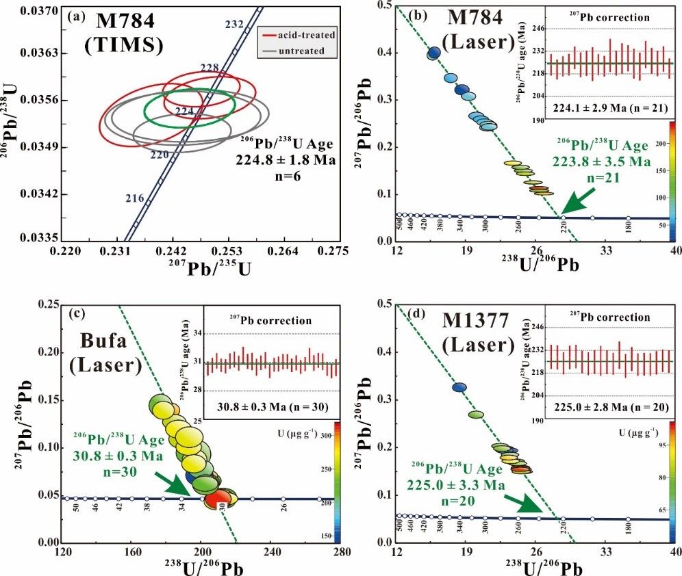 图2 (a) ID-TIMS测定符山石M784(辽宁)样品U-Pb谐和图;(b)-(d) LA-SF-ICP-MS测定符山石M784(辽宁)、Bufa(墨西哥)以及M1377(辽宁)样品的T-W图解与207Pb校正的206Pb/238U年龄