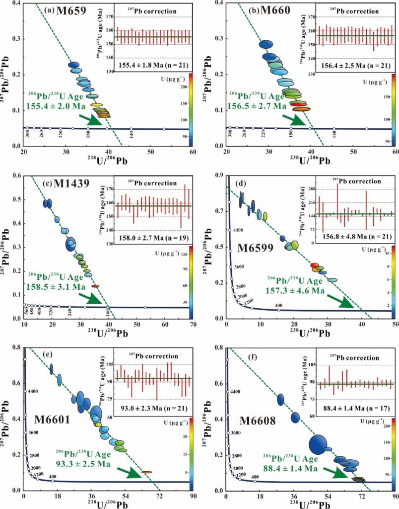 图3 LA-SF-ICP-MS测定符山石(a) M659(湖南)、(b) M660(湖南)、(c) M1439(湖南)、(d) M6599(广西)、(e) M6601(广西)以及(f) M6608(广西)样品的T-W图解与207Pb校正的206Pb/238U年龄