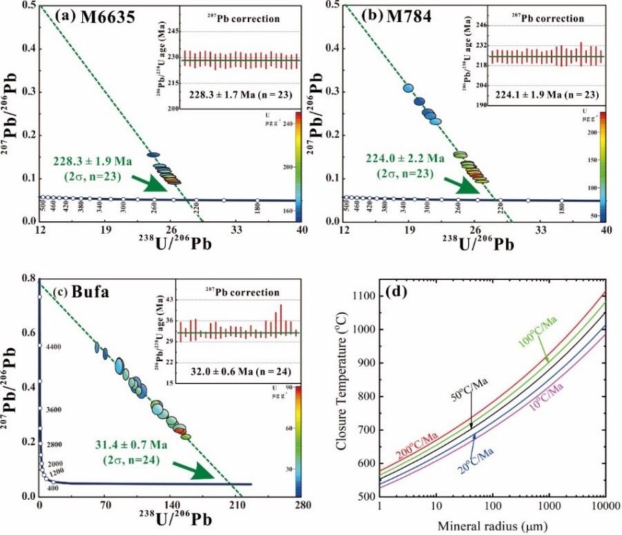 图4 (a-c) LA-SF-ICP-MS测定符山石M6635、M784以及Bufa样品的T-W图解与207Pb校正的206Pb/238U年龄(Wilui符山石作为标样);(d) 符山石U-Pb体系封闭温度