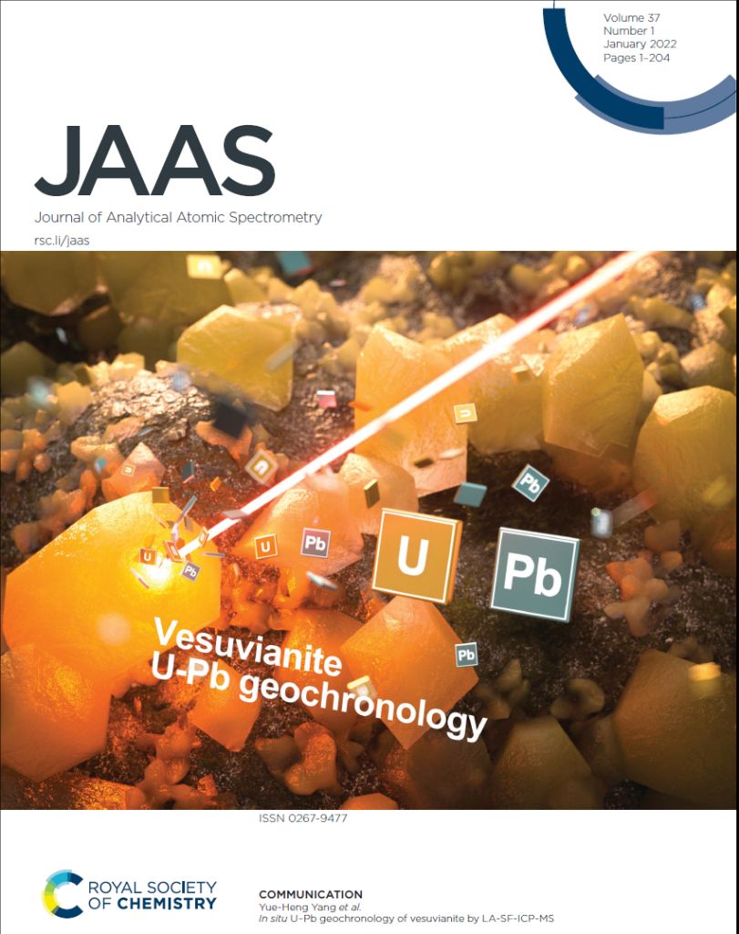 成果作为封面文章发表于英国皇家化学学会出版的原子光谱学权威期刊Journal of Analytical Atomic Spectrometry。(卫钦迪, 杨明, Rolf L. Romer, 王浩, 杨岳衡*, 赵子福, 吴石头, 谢烈文, 黄超, 许蕾, 杨进辉, 吴福元. In situ U-Pb geochronology of vesuvianite by LA-SF-ICP-MS[J]. Journal of Analytical Atomic Spectrometry, 2022, 37: 69-81. DOI:10.1039/D1JA00303H)