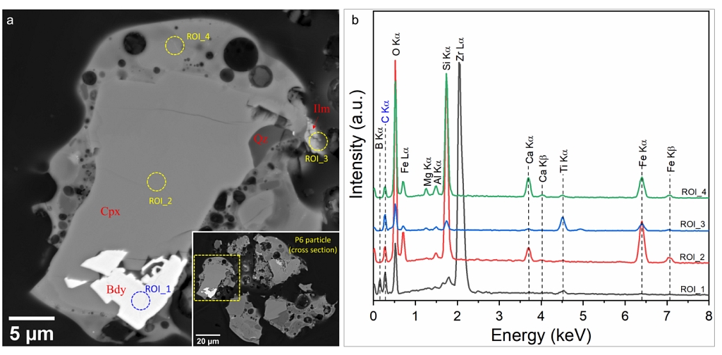 方案一:多颗粒快速定位。利用单颗粒显微操作技术,将微米尺寸的月壤样品制备成单颗粒的阵列。然后利用显微X-射线荧光光谱技术(μXRF)对样品阵列进行“无损、无接触和无污染”的快速扫描分析,获得所有颗粒的化学元素及其分布图像,结合谱学半定量分析技术,挑选出富含锆元素的目标颗粒(图1,如P6和P17)。将挑选出的富锆颗粒进行树脂包埋后,将单颗粒机械抛光与截面扫描电镜观察(SEM)相结合(图2),最终将含锆矿物暴露在样品的平整截面上,并进行后续的二次离子质谱探针(SIMS)微区原位同位素分析,获得该样品的高精度年龄。利用这套方案,研究人员在拿到第一批月壤样品后的24小时内,就从中挑选出47个单颗粒目标样品,并从中精准定位了51个含锆矿物,获得嫦娥五号月壤玄武岩形成的年龄为2030±4 Ma(Li et al., 2021, Nature)。