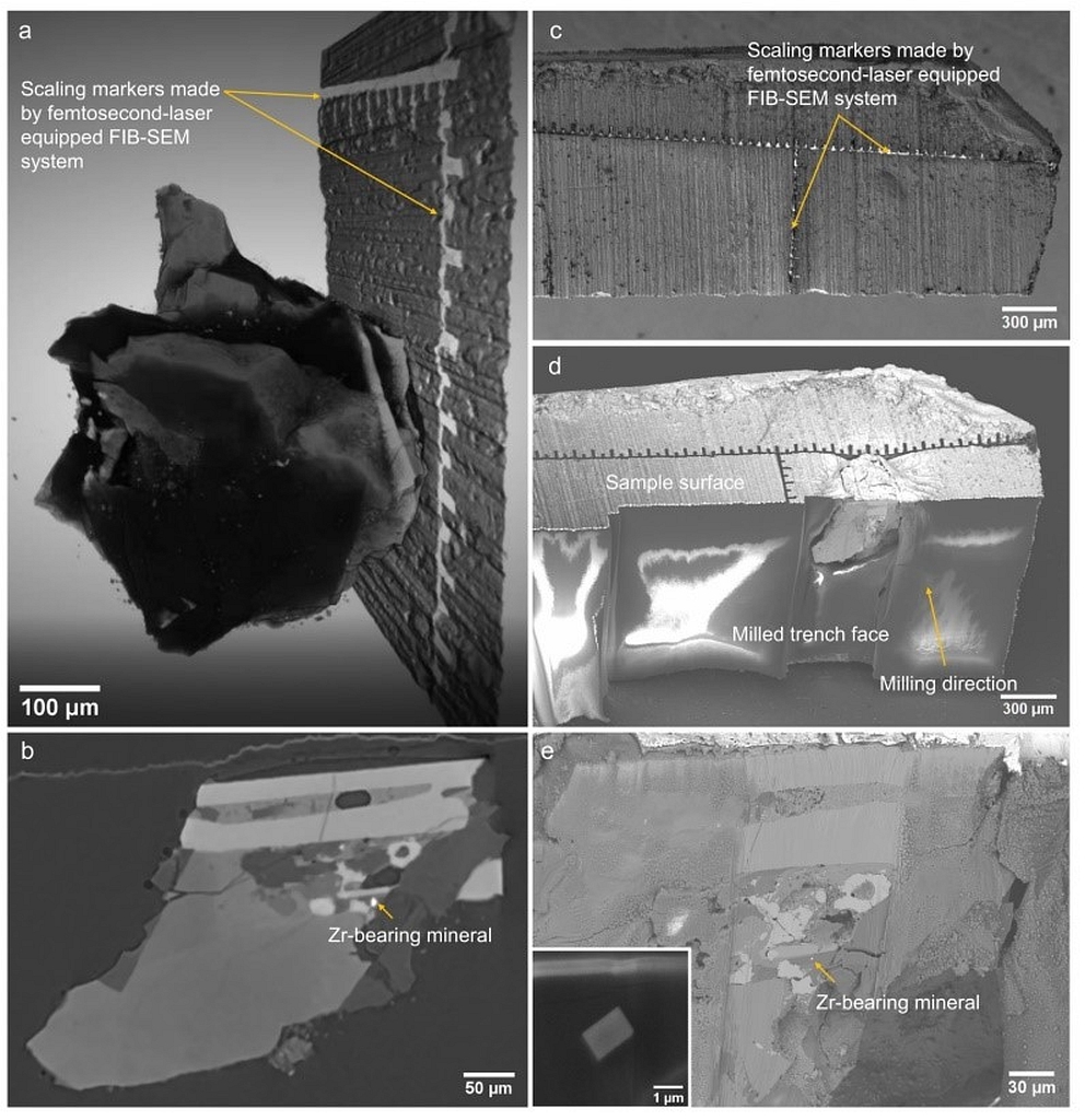 方案二:单颗粒精准定位。第一套方案虽行之有效,但机械抛光过程不能可视化,存在将目标矿物(如斜锆石等)提前磨掉或者损坏的风险。因此,在第二套方案中,研究人员将μXRF的化学元素成像与三维X-射线显微镜(3D-XRM)结构成像分析相结合,将富锆矿物从挑选出的富锆目标颗粒中精准定位(图3)。然后,利用虚拟数字化和3D-XRM与聚焦离子束-扫描电镜(FIB-SEM)三维切片技术,将富锆矿物中目标颗粒中暴露到一个平整的截面上(图4),可用于后续的SIMS微区原位同位素分析。整个样品的FIB切割过程也可以通过SEM技术将其结构和化学成分分阶段地记录下来,从而部分地保留该样品的三维结构和成分信息。