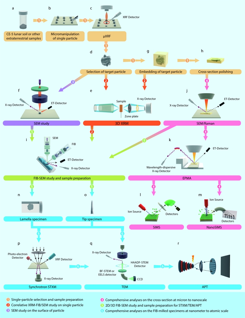 导言:2020年12月17日,嫦娥五号从月球带回1731克月壤样品,中国科学家第一次拥有属于自己的地外天体返回样品,在我国行星科学发展史上具有里程碑意义。月壤样品极其珍贵,多数为亚毫米和微米大小的颗粒。如何利用有限的珍贵样品获得尽可能多的基础数据,同时开展高效高质量的科学研究,对我国科研人员提出了巨大挑战。作为首批获得月壤样品的科研单位,800彩票联合中科院国家天文台、高能物理研究所和物理所等多家单位,协同开展相关技术的研发工作,建立了一套行之有效的月壤返回样品单颗粒综合分析的工作流程图,该技术对于后续的嫦娥六号月壤返回及小行星采样返回等均具有重要的参考意义。