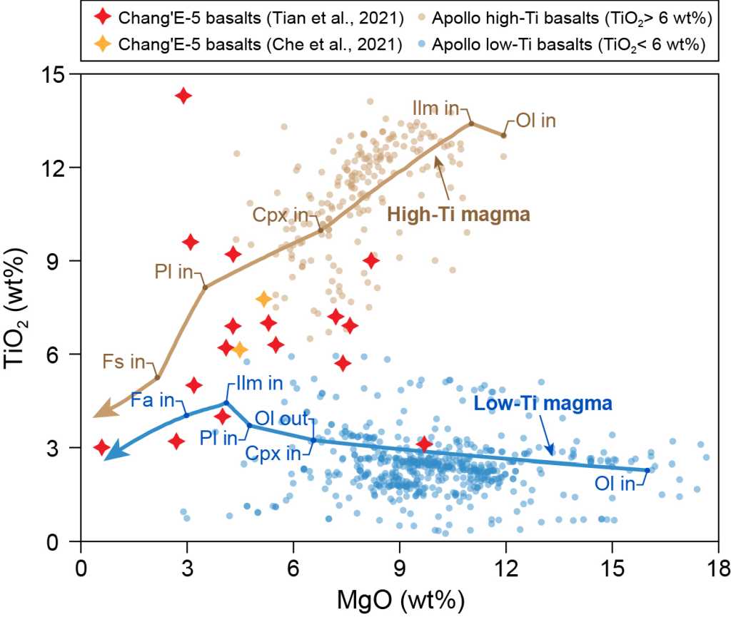 虽然嫦娥五号玄武岩是低钛型,但是与阿波罗低钛玄武岩相比(TiO2集中于2-3 wt%),嫦娥五号玄武岩含有更高的钛含量,暗示嫦娥五号玄武岩与绝大多数阿波罗玄武岩的初始岩浆成分不同,可能反映月球年轻火山和古老火山的月幔源区物质组成、岩浆起源深度或者喷发演化过程不同。这些发现不仅为未来研究月球年轻火山活动机制提供了具体目标,也为研究月球热演化历史奠定基础。
