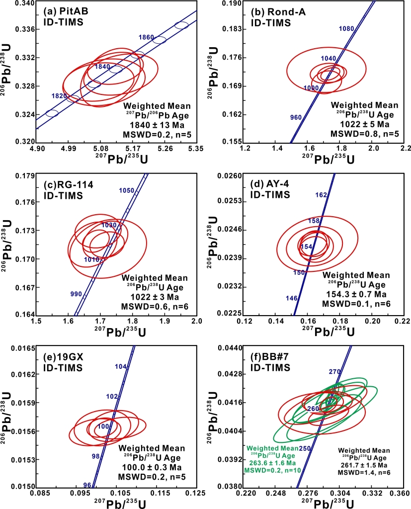 图1 ID-TIMS测定(a)PitAB(巴西)、(b)Rond-A(巴西)、(c)RG-114(刚果金)、(d)AY-4(湖南)、(e)19GX(广西)、(f)BB#7(美国)锡石样品U-Pb谐和图