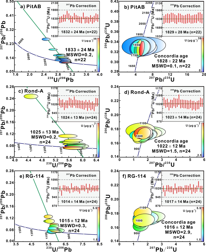 图2 LA-SF-ICP-MS方法测定PitAB(巴西)、 Rond-A(巴西)、RG-114(刚果金)锡石样品的T-W图解与207Pb校正的206Pb/238U加权平均年龄(a、c、e),以及208Pb校正的谐和年龄和206Pb/238U加权平均年龄(b、d、f)