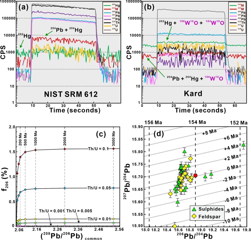 图3 LA-SF-ICP-MS方法分析NIST 612玻璃标准物质(a)与锡石Kard(b)的各质量数信号强度随时间的变化及钨氧离子团的干扰;(c)不同Th/U比值对208Pb普通铅校正方法的影响;(d)普通铅扣除对低238U/204Pb矿物相年龄结果的影响(以AY-4为例)