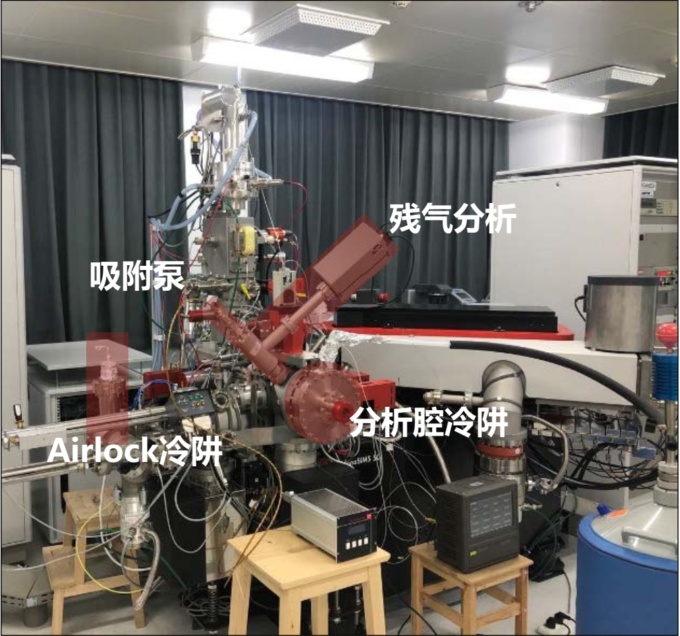 图1 纳米离子探针仪器主体及升级的真空系统(暗红色标注)