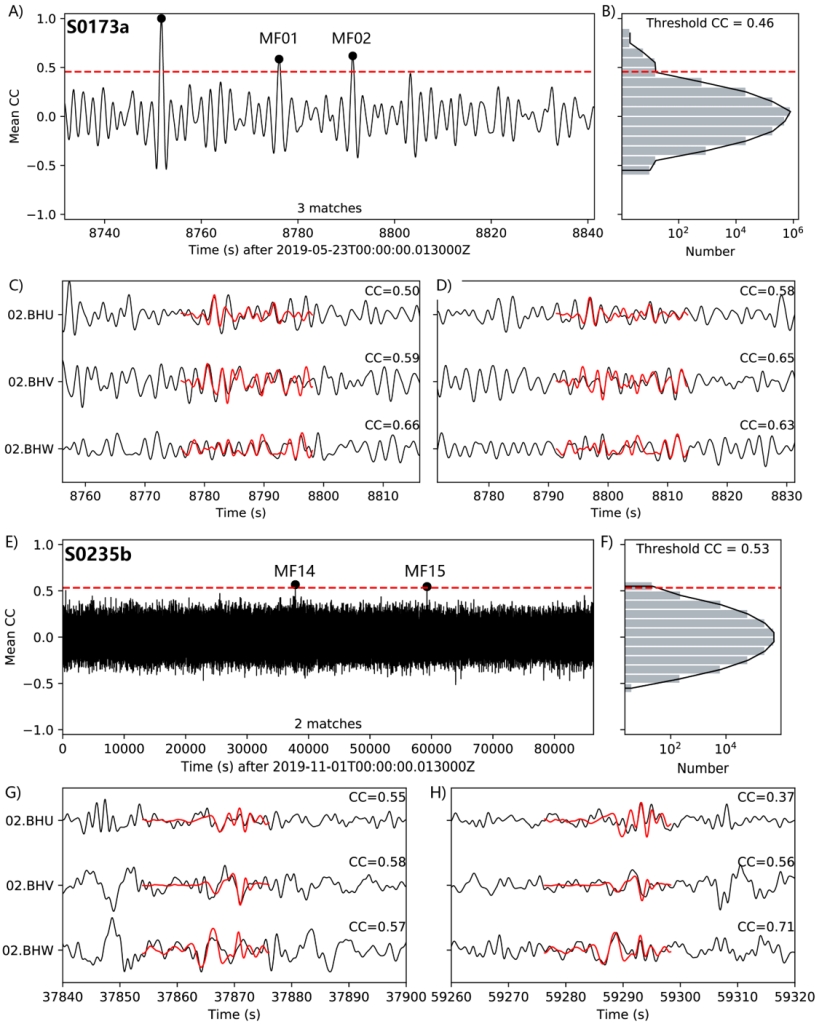 在前期利用月球月震事件研究检测火星震的可行性的基础上,他们利用模板匹配方法从连续波形中搜寻新的火星震事件。他们将这9个火星震标志性信息涉及的波形序列片段与火星地震仪记录的连续波形进行比对,若比对成功后者即可被认为是新的火星震事件,这基于二者是同源的,即这些火星震事件的位置和成因过程均相同或相近。该过程可以类比为大家所熟知的基因序列与基因库的比对过程。实际上,该方法被较广泛用于检测地球上大地震之后小震级的余震事件。