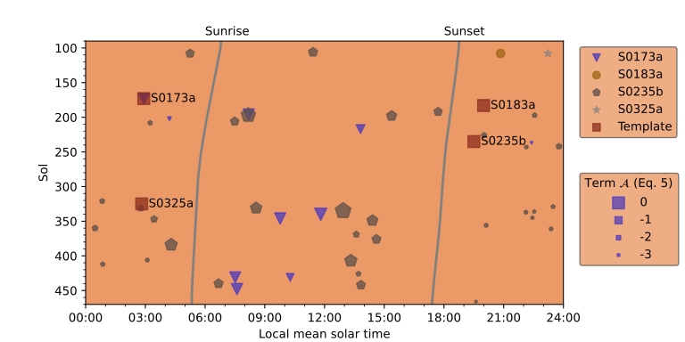 图3 成功匹配的火星震事件的分布,横轴为火星InSight着陆区的当地时间,纵轴为火星日,两条灰色的粗线为火星上日出和日落时间