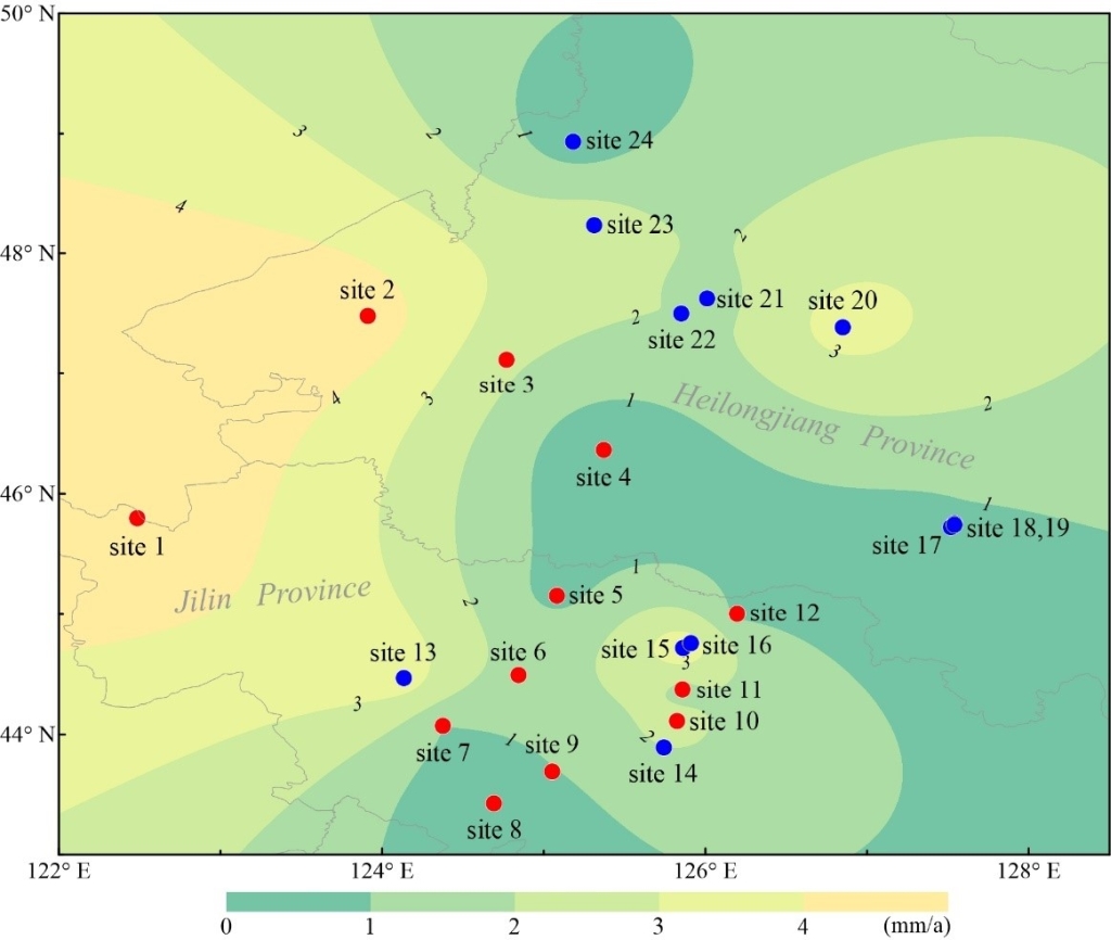 图3 东北黑土侵蚀速率分布图。红色点表示本研究点,蓝色点表示前人研究点