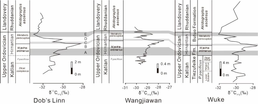 晚奥陶世末期,受沉积相控制,我国华南地区主要发育富有机质黑色页岩,仅在赫南特期短暂发育少量碳酸盐岩沉积。而乌科剖面,不仅出露了连续的上奥陶统碳酸盐岩地层,还保存了典型的晚奥陶世浅水底栖生物的化石、生物绝灭后的微生物岩(凝块石、核形石等),及冰期后的暖水生物(图1)。在此基础上,将乌科剖面上奥陶统顶部识别出(七个)典型沉积旋回与具有良好笔石生物带约束的深-浅水过渡剖面“万和”剖面的旋回一一对照,同时结合碳同位素地层学(图2),准确建立起乌科剖面上奥陶统时间地层格架,为后续在华南地区对LOME时期生物与环境相互作用的研究打下了基础。