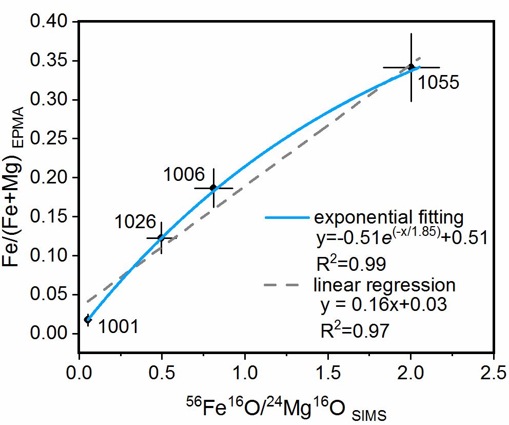 离子探针(SIMS)为在微米尺度上研究含氧矿物的原位同位素记录提供了一个新的维度,但利用SIMS对成分变化矿物进行高质量的氧同位素分析极具挑战性。对于白云石这种Fe-Mg比例变化极大的矿物,传统上需要研发一系列覆盖成分(Fe# = Fe/(Fe+Mg))变化范围的标样来拟合校正曲线,对于未知样品,则需先经过电子探针测定成分后,再在相同区域做离子探针分析,才能校正由成分变化造成的离子探针分析的同位素分馏(基体效应)。一方面,这种传统的离线流程费时且本质上并不准确,因为电子探针(EPMA)和SIMS这两种仪器分析的区域难以匹配(涉及分析束斑大小、深度、形状及位置等方面)。另一方面,对于成分变化大的矿物,研发一系列成分不同的标准样品本就是非常费时耗力的过程。因此,评估和改进传统离线方法对成分变化矿物准确有效的SIMS氧同位素分析至关重要。