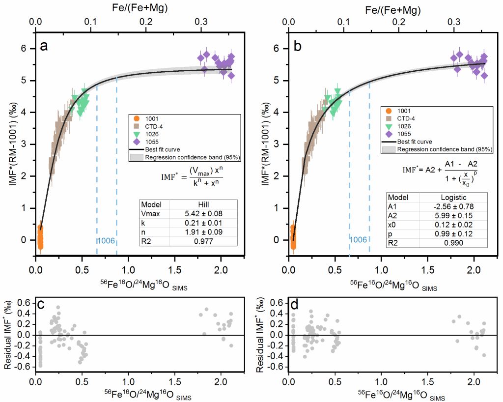 2 SIMS在线测量数据Hilla)和Logisticb)方程拟合结果对比。IMF*(RM-1001)(‰)为仪器的测量偏差标准化(IMF)到1001标样的值。Hillc)和Logisticd)方程拟合的IMF*残差图