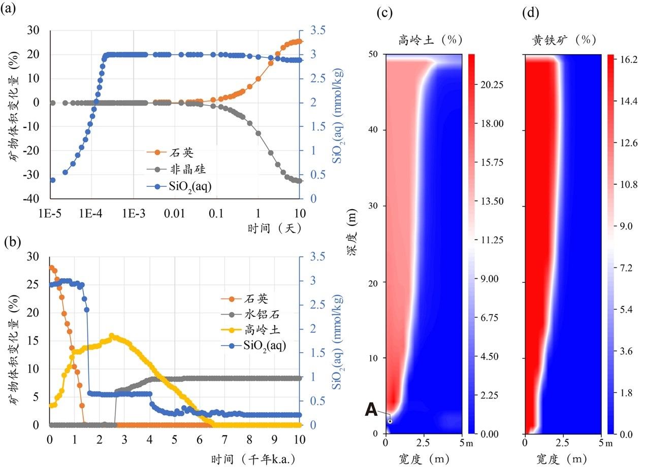 2 ab)模拟区底部观测点矿物蚀变过程,左纵坐标为矿物体积变化量,负值代表体积减少、正值代表体积增加,右纵坐标为液相二氧化硅浓度;(cd)模拟期结束时高岭土与黄铁矿在模拟区的体积百分比分布情况,模型宽度为5 m、深度为50 m