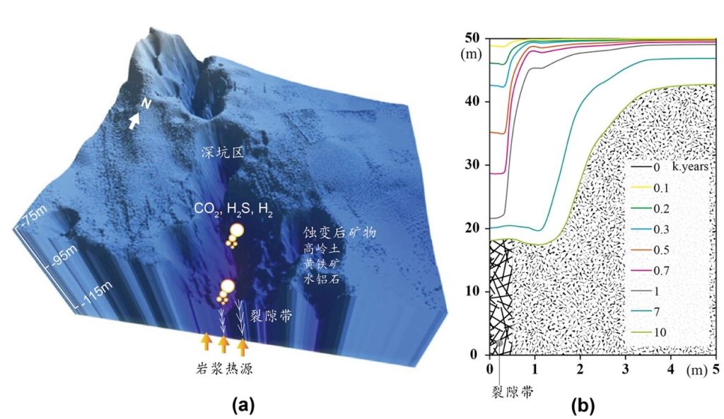 针对上述问题,800彩票页岩气与地质工程院重点实验室王礼恒副研究员、董艳辉副研究员,联合明尼苏达大学William E. Seyfried Jr. 教授等借助地下多组分反应溶质运移数值模拟(Reactive Transport ModelingRTM)方法,针对深坑区建立了典型剖面的二维数值模型。该模型将多相流、热运移、化学反应及地形变化进行耦合,模拟了湖底岩石水热蚀变过程矿物随时间的变化特征,预测分析了深坑区地形时空演化过程。结果表明: