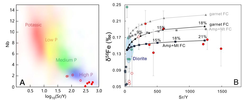 考虑到大多数岩石中副矿物本身含量极少,且大部分副矿物又都具有极低的Fe含量,因此副矿物的存在通常不会影响岩浆的Fe同位素特征。此外,不同的造岩矿物又通常具有不同的Fe同位素分馏系数。因此Fe同位素等非传统稳定同位素为限制TTG等花岗岩类的源区特征和演化过程提供了新的工具。