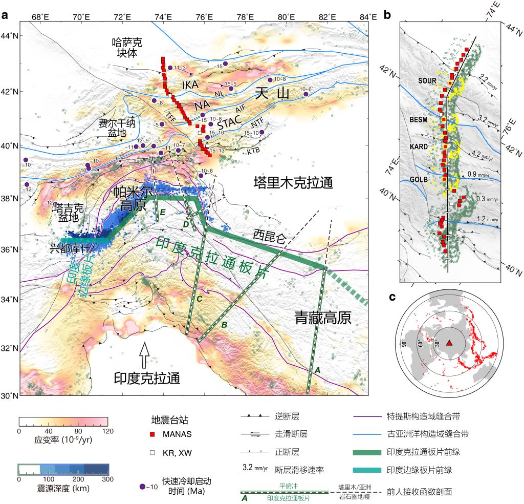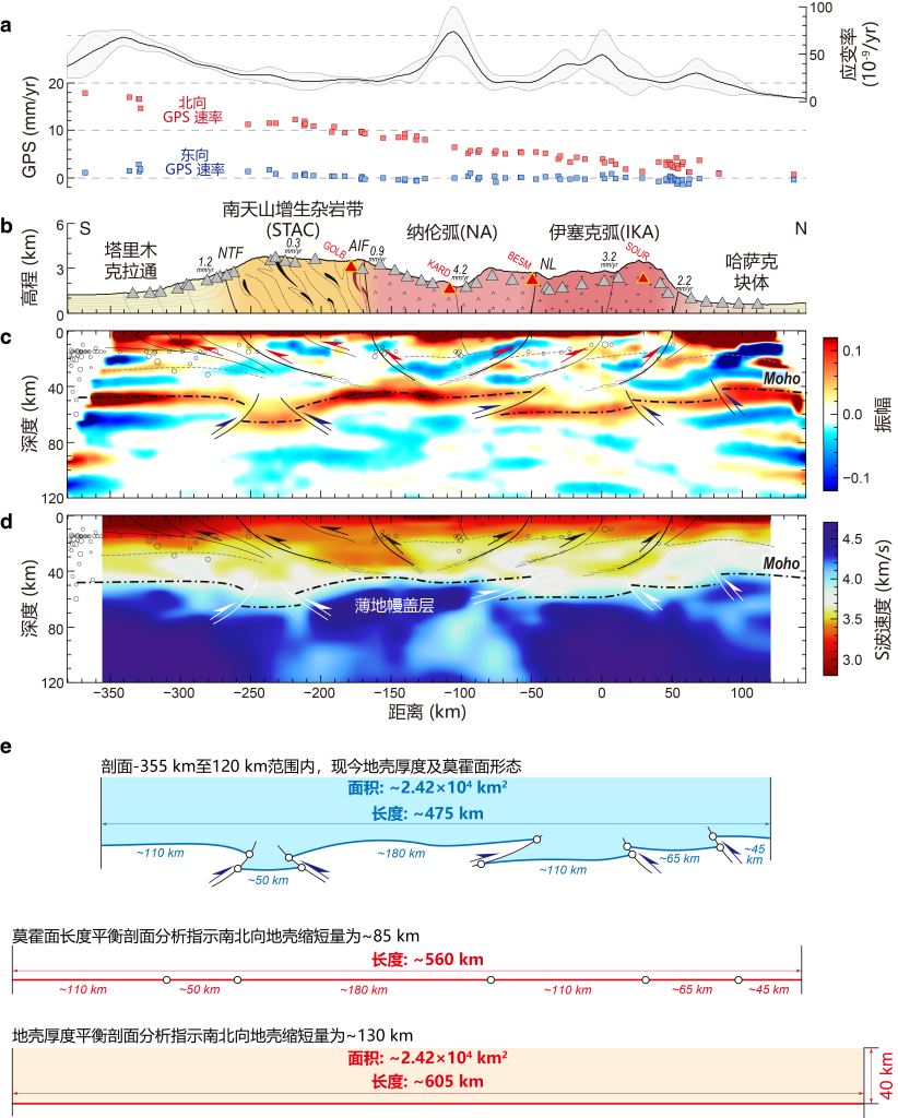 为此,中科院800彩票岩石圈演化国家重点实验室壳幔结构探测学科组博士后李玮与合作导师陈赟副研究员、肖文交院士、德国地学研究中心(GFZ)袁晓晖、英国莱斯特大学Brain F. Windley教授等合作,主要基于MANAS计划宽频带地震观测资料(图1),在有效解决不同资料联合反演过程中面临的信息来源同化、敏感度取舍、分辨率协同等关键技术问题的情况下,开展远震接收函数与面波频散联合反演和共转换点叠加成像研究,构建了横跨中天山典型剖面的地壳上地幔精细几何、速度结构,揭示了中天山垂向上浅部地壳逆冲推覆、深部莫霍面错断叠置、横向上由构造继承性主导的分布式变形特征;在厘清新、老构造关系的基础上,通过平衡剖面、变形速率分析等估算得到新生代天山地壳缩短仅为百公里级,其主要活化、隆升启动时间约为10Ma;结合这一变形的时间-空间特征,与印度板片向北楔入与塔里木克拉通发生作用的进程相吻合,从而指示印度塔里木岩石圈地幔的直接碰撞是天山活化、隆升的根本动力来源(图3)。