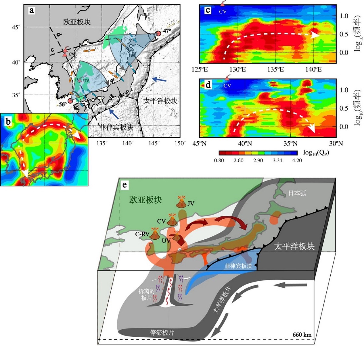 在中国东北地区下方,软流圈热物质的上升运动可能在上地幔顶部形成多条通道,成为长白山、镜泊湖和中加良火山的岩浆供给源 (图3a)。在日本海下方,两条Pn波强衰减带与Pn波快轴方向吻合 (图4a),可能说明地幔流从中国东北向东和向南流动 (图4b-图4d)。Pn波速度成像和各向异性结果表明在日本海下方存在横向地幔流 (Du et al., 2022; Lü et al., 2019)。Pn波衰减模型揭示出,两条地幔流的位置垂直于俯冲海沟的走向,且与西太平洋和菲律宾板块俯冲回退的方向吻合,因而其驱动力也许能够归因于菲律宾海和太平洋板块的俯冲以及由此产生的发散回退 (divergent rollback)。中新世至上新世期间,在发散地幔流推动下,日本海可能呈“双扇门”状旋转张开 (Otofuji et al., 1985) (图4e)。现今日本弧火山向西迁移,说明日本海可能正处于闭合的初始阶段 (Martin, 2011),这一过程并不会明显改变地幔流形态。日本海盆西北边缘和对马盆地都具有较厚的洋壳结构 (Kim et al., 1998; Sato et al., 2014),以及强烈的Pn波衰减,说明地幔热物质运移过程不断对上覆地壳加热,并使之熔融和增厚,遂形成现今独特的地壳结构及相应的弧后盆地系统。