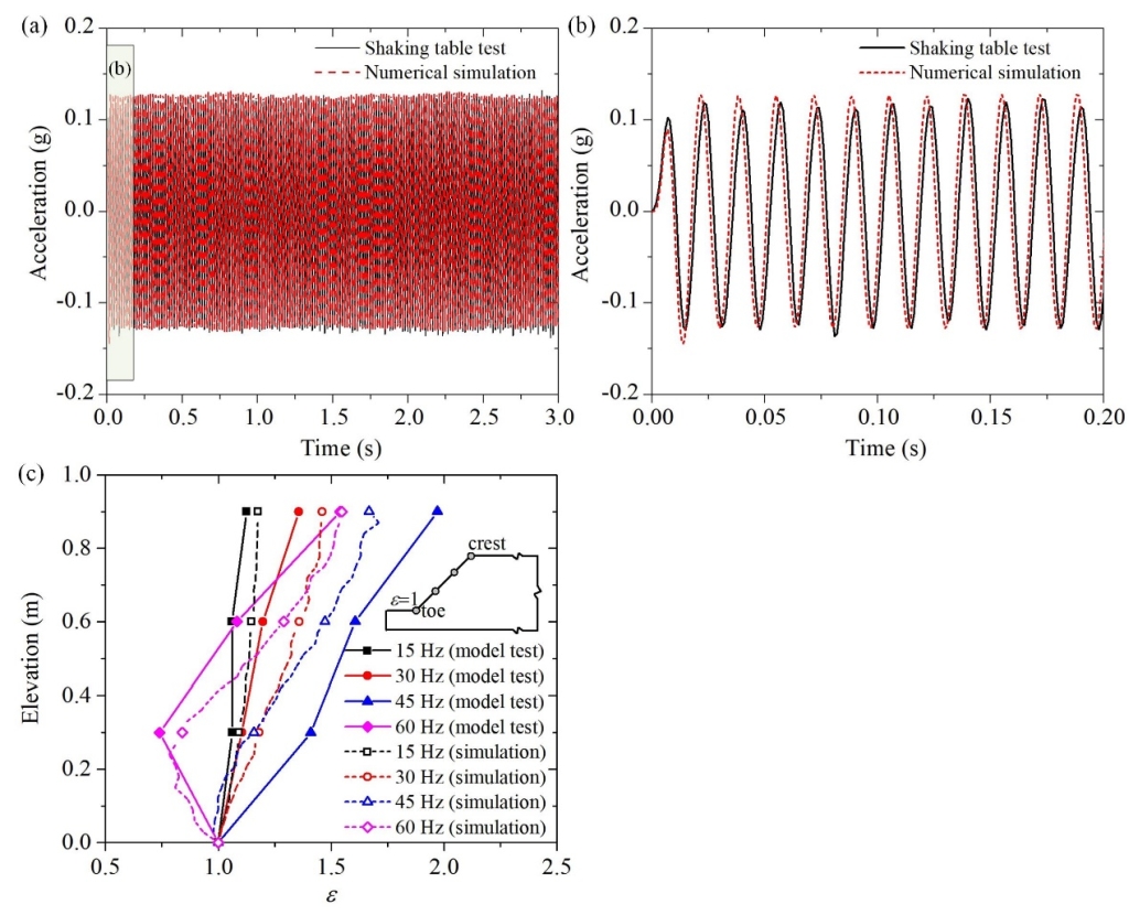 图2 (a)振动台试验和数值模拟加速度时程曲线;(b)加速度局部放大图;(c)坡面PGA放大系数