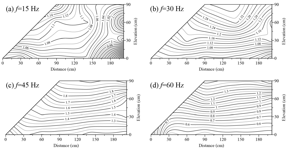 图3 不同频率下边坡加速度放大系数分布图。(a)加载频率为15Hz;(b)加载频率为30Hz;(c)加载频率为45Hz;(d)加载频率为60Hz