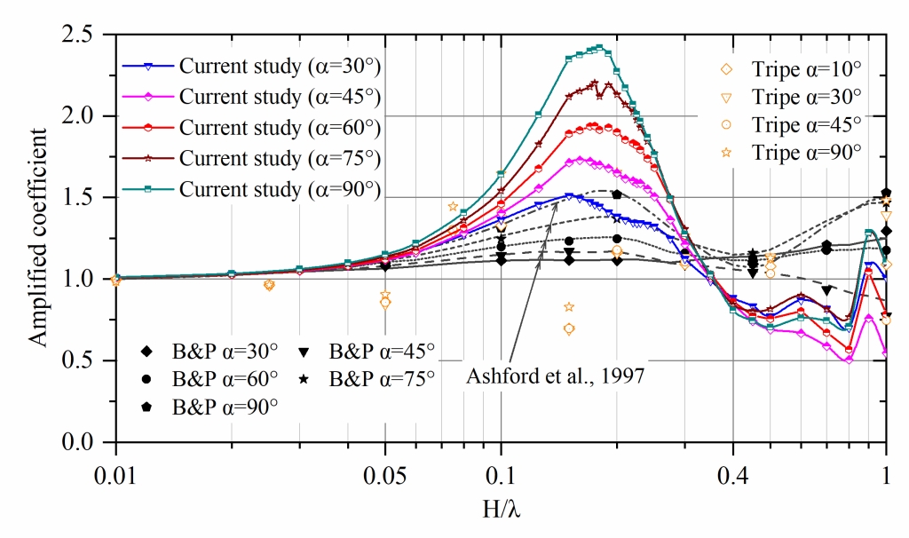 图4 坡肩峰值加速度放大系数(坡高H=60 m)及与前人研究对比((Ashford et al.,1997)、B&P(Bouckovalas and Papadimitriou, 2005)和(Tripe et al.,2013))