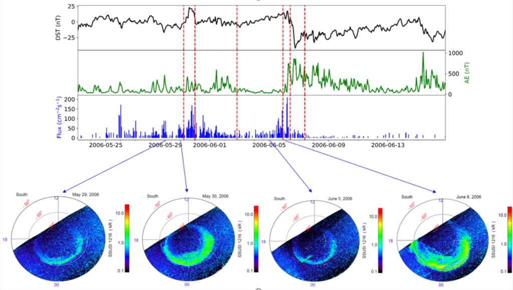 2显示了2006523日至617日期间AE指数、DST指数、太阳风O+通量及两次明显的极光增强事件。DST是有地球中低纬度区域的磁场台站数据推导的磁场扰动,反映的是全球磁场爆。而AE指数反应地球高纬度的磁场扰动,直接反映极光电流的强度。可以清晰地看到太阳风O+通量在529日和65日分别出现明显增强。与之对应的是DSTAE指数出现明显扰动,DMSP卫星观测到的极光也出现明显的增强特性。