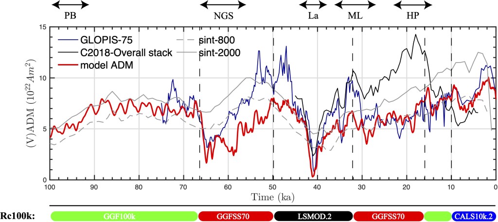 2 由古地磁模型预测的轴向偶极矩(ADM)在过去十万年间的变化。图中还展示了数个从全球分布的相对古强度(RPI)记录中获得的虚拟轴向偶极矩大小(VADM)随时间的变化。数次地磁偏移的时间标注在图的上方(双箭头长度范围)