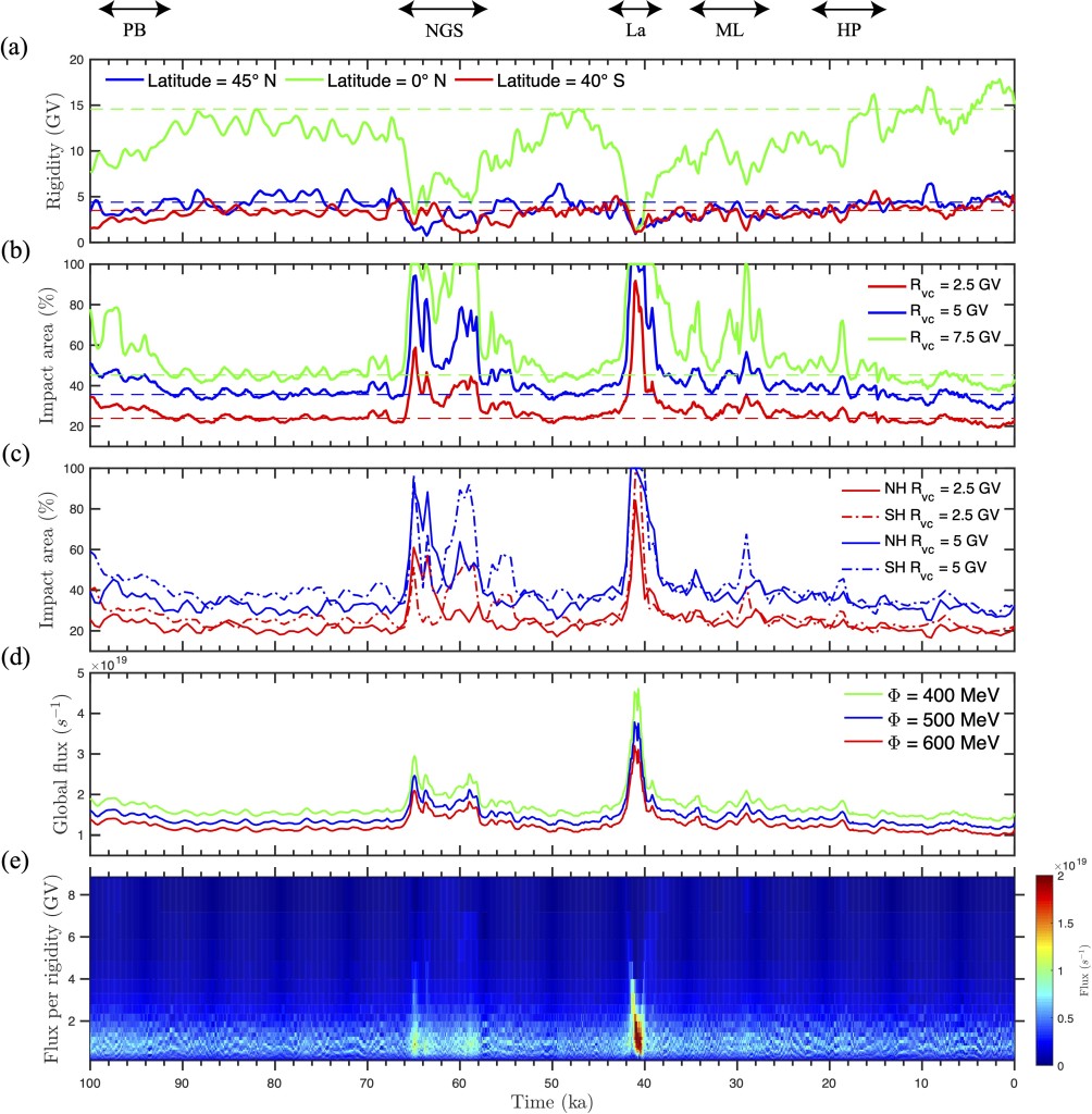 3 过去十万年期间地磁场截止刚度的变化。(a)北纬45°,赤道,南纬45°处的截至刚度随时间的变化。(b2.5 GV以及5 GV宇宙线能穿透的面积占地球总面积的比例。(d)进入地球电离层的宇宙线通量。(e)不同能量宇宙线进入电离层的通量。过去十万年间发生的五次地磁偏移标的时间注于图的上方