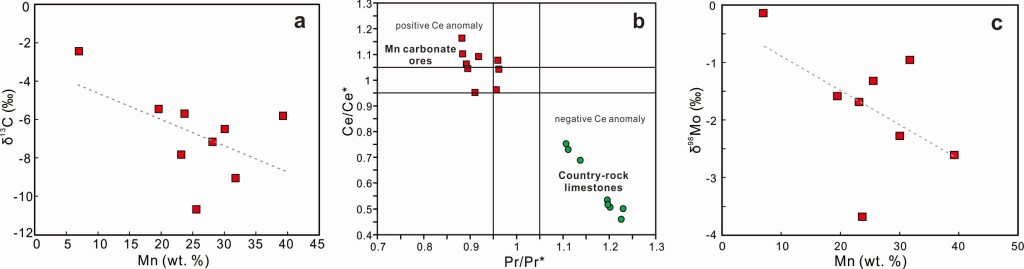 昭苏锰矿赋存于石炭系阿克沙克组海侵层序上部的泥质灰岩中,矿石矿物主要为锰碳酸盐(菱锰矿、锰方解石),次为硫锰矿(图1)。局部可见锰碳酸盐矿物呈核-边结构,核部为锰方解石,边部为菱锰矿(图1b),该结构一般认为是早期成岩阶段的产物。矿石中的有机质常被锰碳酸盐矿物交代(图1e),结合矿石明显偏负的碳同位素值(图2a),说明成岩过程中有机质分解产生的CO32-对碳酸锰矿物的形成具有重要的贡献。锰矿石的稀土元素经页岩标准化后,显示明显的正Ce异常(图2b),另外锰矿石还具有偏负的Mo同位素值(图2c),这些特征与现代氧化水体中形成的锰结核一致。综合上述,认为昭苏碳酸锰矿石初始沉积自氧化水体,是锰氧化物与有机质发生成岩还原反应的产物,在此过程中继承了原始锰氧化物吸附的稀土元素及Mo同位素信号。