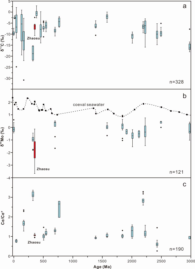 此外,对地质历史中不同时代的典型沉积碳酸锰矿床的特征综合分析发现(图4),它们大部分与昭苏锰矿的地球化学特征相似,普遍具有低于同期海水的C-Mo同位素值以及偏正的Ce异常,说明这些碳酸锰矿床的成因也应与原始锰氧化物埋藏-成岩转变有关,均记录了氧化的沉积水体条件。虽然近些年来有不少学者论证了缺氧水体中直接形成富锰碳酸盐的可能性,但需注意和强调的是,针对富锰地层,尤其是沉积碳酸锰矿床,只有开展系统的地质-地球化学-同位素综合研究,才可能对其锰沉积富集的具体途径有较为全面的认识。