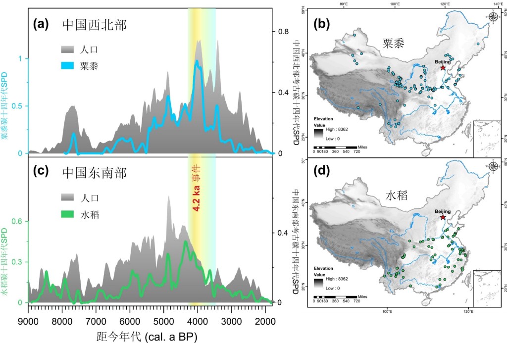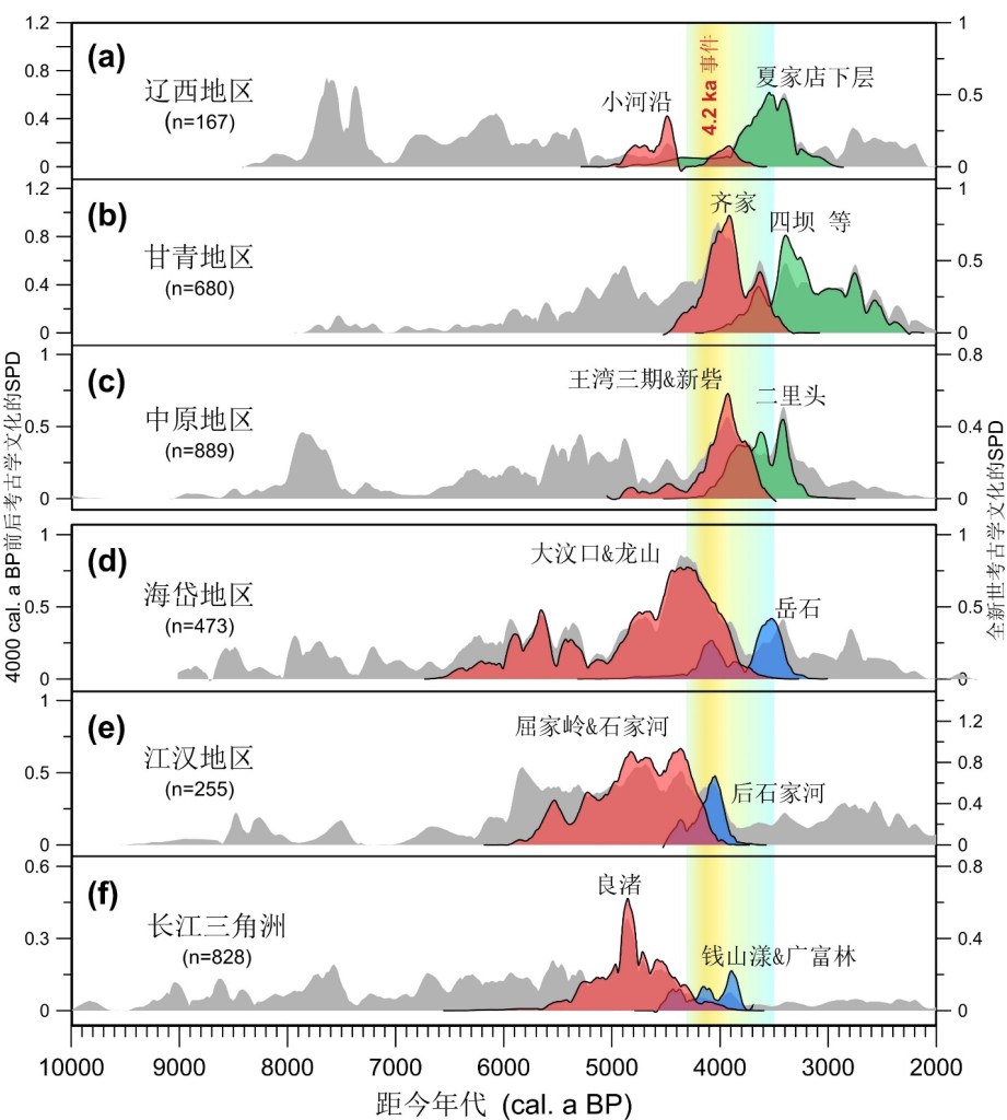 800彩票贺可洋博士后、吕厚远研究员、郭正堂研究员等,联合山东大学靳桂云教授、王灿教授、北京大学张海副教授及云南师范大学沈才明教授等,通过建立中国六个文化区的新石器-青铜时代包含4160个碳十四年代数据和336个植物考古数据的数据库,以及我国包含4.2ka事件信号的定量的古环境记录(1),运用碳十四总和概率密度(SPD)和主要农作物比例的方法,高精度、定量来重建各个区域人口历史、农业活动及其对4.2ka事件的响应。研究发现: