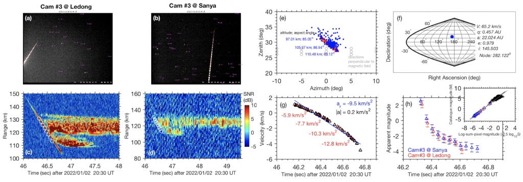 图2 MIOS系统2022年1月2日20时30分观测结果。(a-b)光学轨迹的视频合成图像; (c)相控阵雷达流星头和等离子体尾迹非镜面回波强度图; (d)全天空雷达非镜面回波强度图;(e)光学轨迹和等离子体尾迹不均匀体回波空间位置; (f) 流星辐射点和轨道参数; (g)流星体/流星头回波在大气中的减速过程;(h)流星光学强度时变曲线