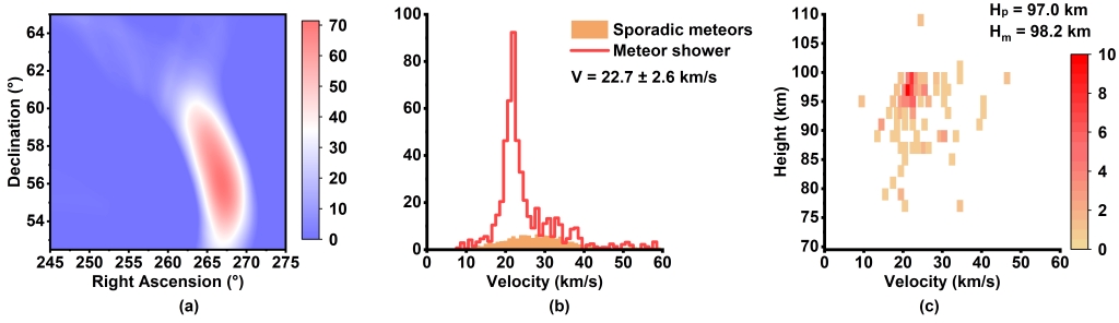 图3 MIOS全天空雷达观测的天龙座流星雨流星(a)辐射源、(b)速度和(c)高度分布特征
