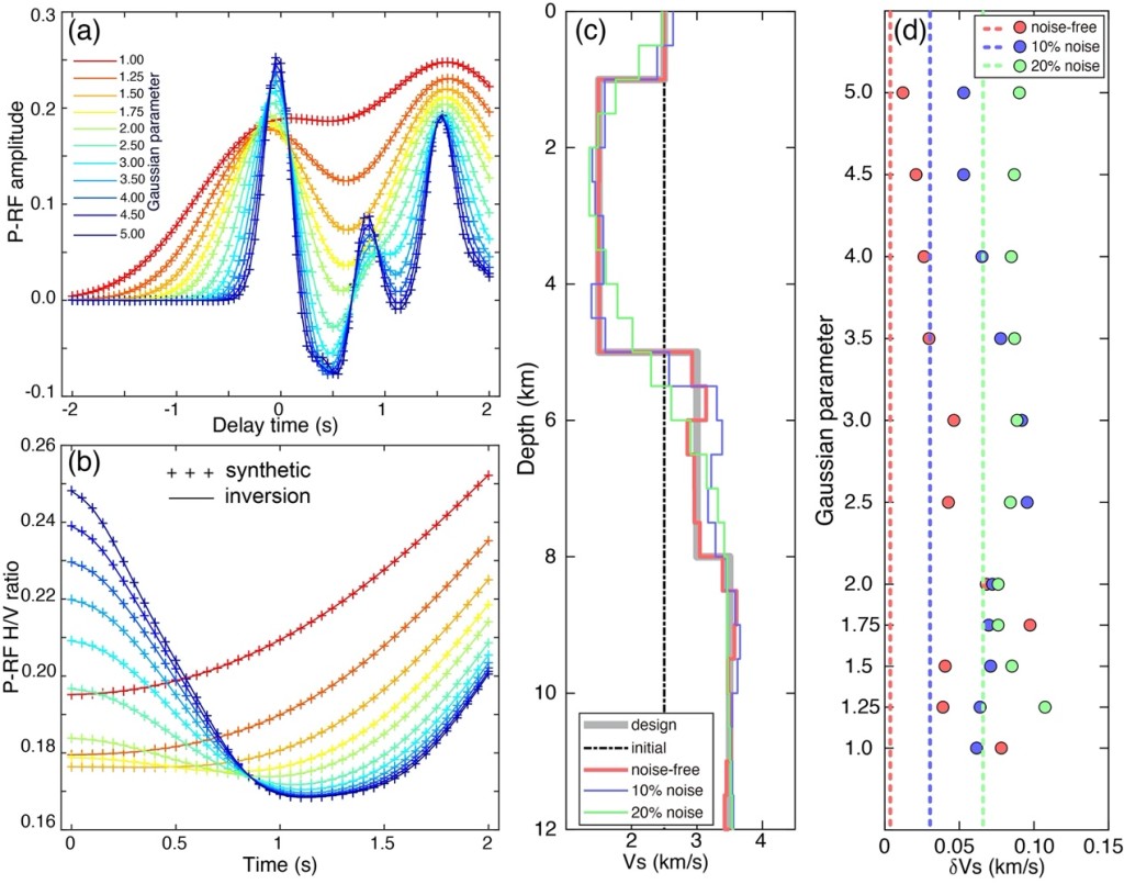 接收函数是反映地震台站下方壳幔波速界面对地震波响应的时间序列,其直达波震相包含了丰富的浅部介质波速结构信息且仅对台站下方小孔径范围内的结构敏感。接收函数波形及其径向-垂向振幅比分别对速度跳变和绝对速度敏感,且两者均具有频率依赖性(即随频率改变而发生变化)。联合这两种数据及其频率依赖性能够有效提高浅部地壳结构的成像精度,但缺乏系统的研究。中科院地质与地球物理研究所岩石圈演化国家重点实验室大陆岩石圈演化动力学学科组王旭博士后与合作导师陈凌研究员以及来自伊朗地质调查局等的学者合作,发展了基于多频接收函数波形与振幅比联合反演单个台站下方浅部(十数公里以浅)S波速度结构的新方法(图2)。相比于传统的走时和面波类方法或单频反演方法,新方法垂向分辨率更高(可达公里级),并且适用于单个台站和地震稀疏区域。