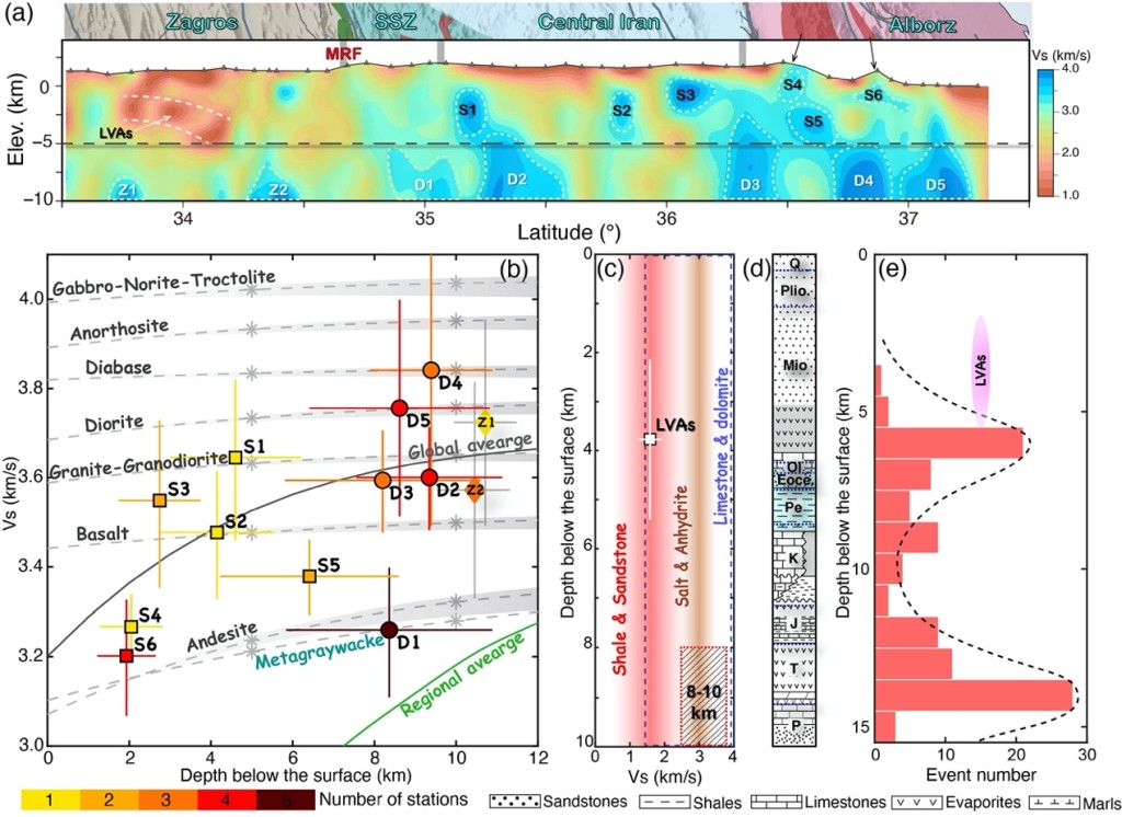 图3 沿主剖面S波速度结构(a),观测与实验室波速测量对比(b-c),扎格罗斯西北部岩性柱剖面(d)和地震活动性(e)。a中白色和黄色虚线分别标示出低速(LVAs)和高速异常体范围(D*, S*, Z*)
