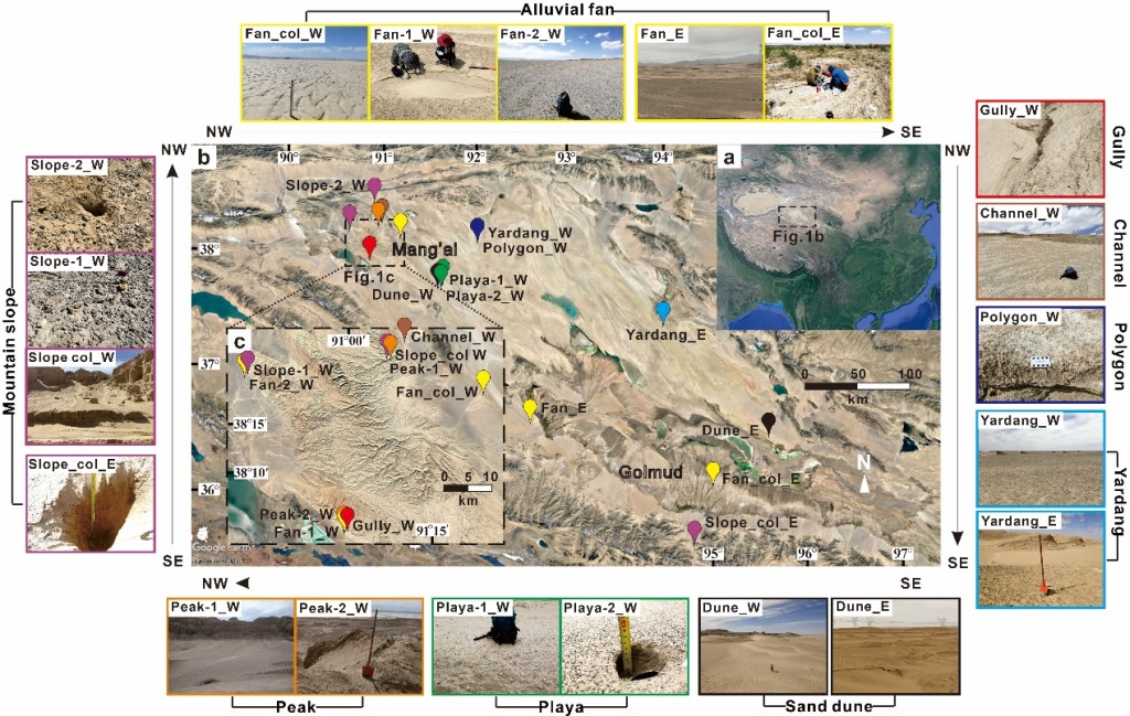 1 柴达木盆地采样点分布。(a)柴达木盆地的地理位置,(b)本研究采样点的分布图,(c)柴达木盆地西北部芒崖地区放大图
