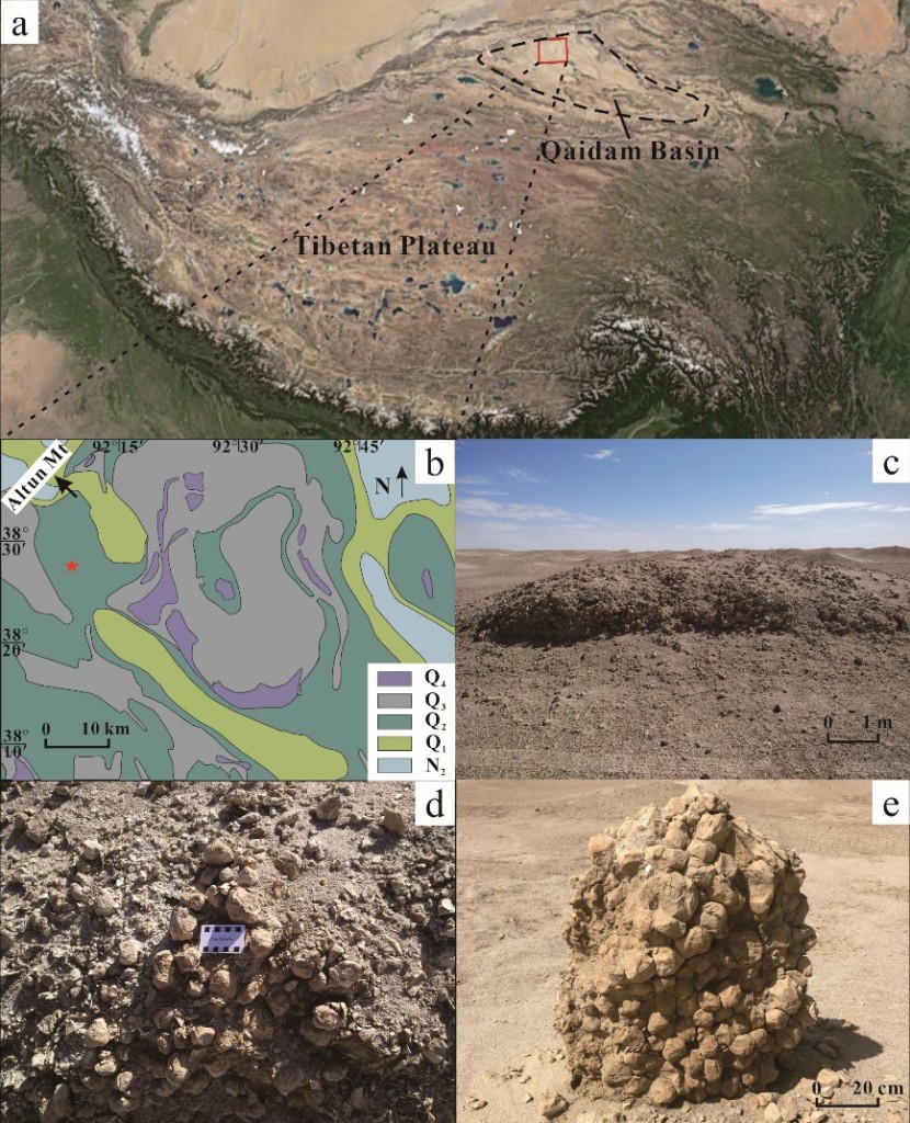 1 柴达木盆地碳酸盐结核出露区域的地质背景。(a)柴达木盆地的地理位置;(b)结核样品的采样地点及地质背景;(c-e)结核样品的野外照片