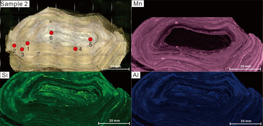 近日,800彩票地球与行星物理院重点实验室地球与行星磁场及宜居性学科组的陈妍博士后与合作导师林巍研究员等,联合中科院深海科学与工程研究所屈原皋研究员团队,利用X射线荧光光谱和傅里叶转换红外光谱(FTIR)对柴达木盆地的典型结核样品进行了系统分析。X射线荧光光谱研究发现,结核的核部几乎不含元素Mn,而外部圈层具有较高的Mn含量(图2)。结核外部圈层的Mn分布具有明显的环带结构,其中疏松环带的Mn含量较致密环带的要高。样品中SiAl等元素的分布没有表现出明显的环带结构。