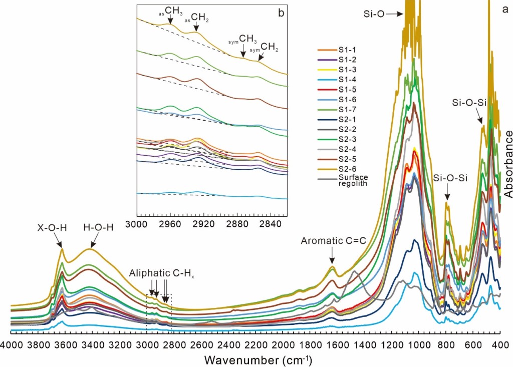 基于比较行星学的科学思路,上述研究表明火星盖尔陨石坑中的结核构造可能具有重要的天体生物学意义,如果早期火星曾经孕育过生命,那么这些结核具有在极端干旱和强烈辐照的环境中保存碳质生命信号的潜力。傅里叶转换红外光谱对诸多有机信号敏感,在不同空间尺度可以快速评估岩石和土壤样品中有机质的含量、分布和化学组成等,因此可以作为火星生命信号探测和返回样品研究的重要技术手段。