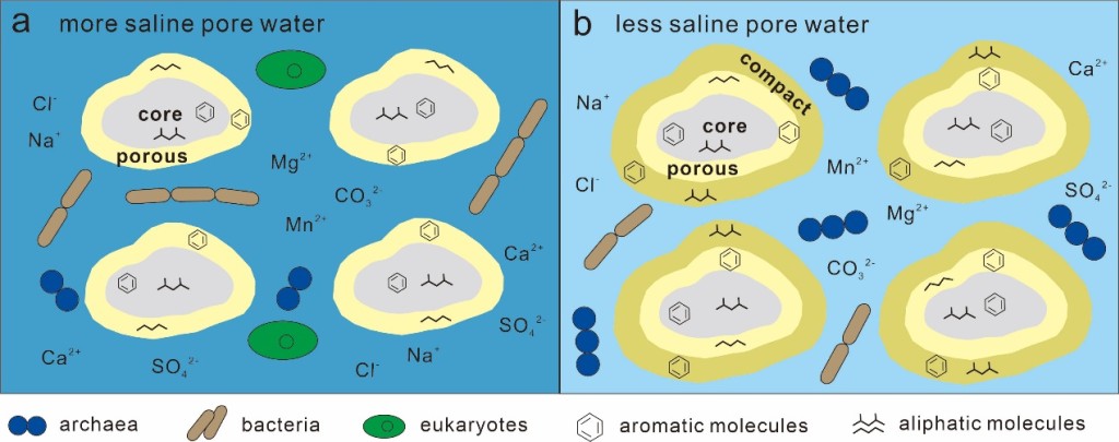 4 柴达木盆地结核样品中碳质生物信号以及成岩流体中微生物群落变化的示意图。(a)结核疏松高Mn环带R3/2值较低,指示了盐度较高的孔隙水含有古菌和细菌并可能有真核生物;(b)结核致密低Mn环带R3/2值较高,指示了盐度较低的孔隙水中可能含有细菌和更多的古菌