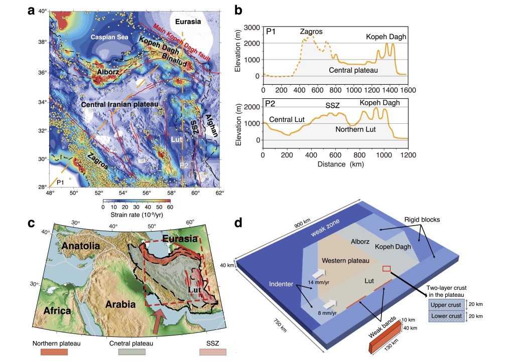 图1 (a) 地表应变率分布,黄点代表地震分布,SSZ代表锡斯坦缝合带;(b) 地表地形起伏特征,反映高原非渐进式的隆升特征,位置由(a)中橘黄色虚线表示;(c) 伊朗高原主要构造特征及研究区位置;(d) 模型设置