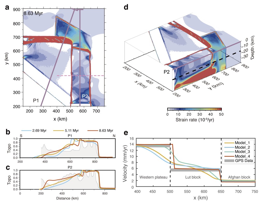 图2 高原流变结构横向不均一模型(Model_4),即同时考虑最弱的高原北部、Lut块体与西部高原和锡斯坦缝合带的流变差异。其它模型(未显示)不考虑流变结构的横向变化(Model_1)或者仅考虑部分横向变化(Model_2、Model_3)。(a) 地表水平应变率的二阶不变量;(b-c) 地形的演化特征,位置由(a)中紫线所示;(d) 沿P2垂直剖面水平应变率的二阶不变量;(e) 各个模型中西部高原和Lut块体北向汇聚速率与GPS观测的对比