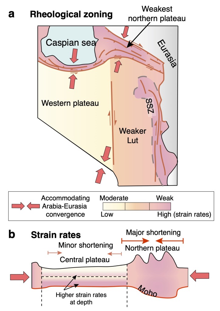 伊朗高原具有显著的应变分区特征(图1):(1)变形和隆升主要集中于南部的碰撞前缘(即Zagros造山带)和北部边界带(包括Alborz和Kopeh Dagh造山带)。(2)高原中部被一系列大型南北向走滑断裂分成若干块体。大地测量学和地质学等基于浅表观测的研究认为,这些块体内部缩短变形较小,在走滑断裂的调节下整体向北运动,可能是刚性块体。但地震学成像研究显示,高原中部的岩石圈较薄(<100 km)且波速相对较低,因此可能温度较高、强度较低。最新的地震各向异性研究表明,高原中部岩石圈虽然地表变形较弱,但岩石圈地幔和下地壳可能分别受地幔流动和大型走滑断裂的影响而发生了显著的剪切变形(《岩石圈性质不均一性控制伊朗高原东北部和东部陆内变形模式》)。这就引发了问题:伊朗高原中部块体强度较低、容易变形,为什么在其将应力从碰撞前缘传递至高原北部边界区域时却没有发生显著浅表变形?要了解伊朗高原的变形模式和非渐进隆升机制(图1),就需要认识高原岩石圈的流变结构及其如何控制陆内的应变分布。
