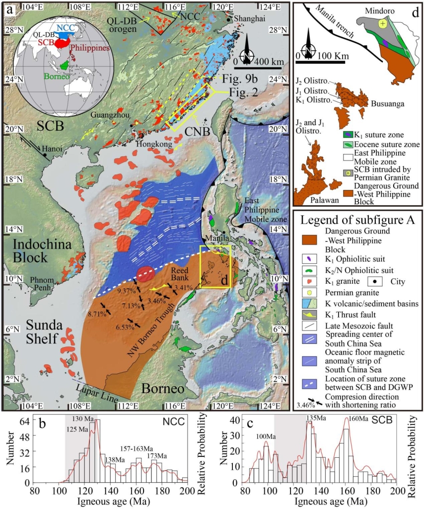 2)经过华南-南海-东南亚的地质对比,研究认为该NW-SE向挤压收缩体制由西菲律宾陆块和华南的碰撞事件导致。西菲律宾群岛的民都洛岛(Mindoro Island)上发育的K1蛇绿岩代表了西菲律宾-华南碰撞形成的缝合带(图1)。以此为界,民都洛北部陆壳被二叠纪花岗岩侵入,可与华南对比;民都洛南部陆壳则属于西菲律宾陆块。缝合带从民都洛岛向SW延伸,其南侧南沙海域(属于西菲律陆块)的K1地层缩短率由北向南减小(图1)。西菲律群岛和南沙海域向S的逆冲和长乐-南澳构造带向NW的逆冲在K1时构成逆冲-反冲构造,指示了NW-SE向挤压。华南东部和南海海床中发育的K1/K2不整合,以及西菲律宾陆块K2时接受华南的碎屑供给说明此时两个陆块的碰撞缝合已完成。