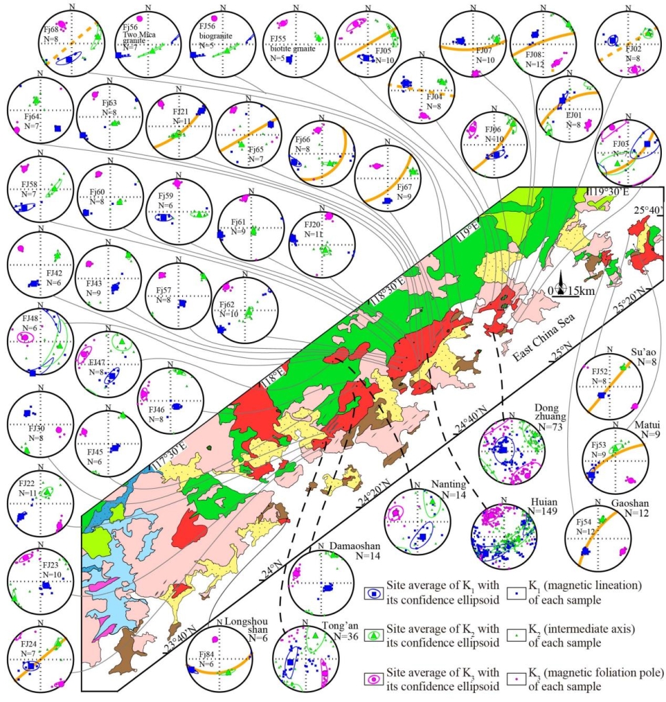 图2 长乐-南澳构造带同构造花岗岩的磁组构特征图