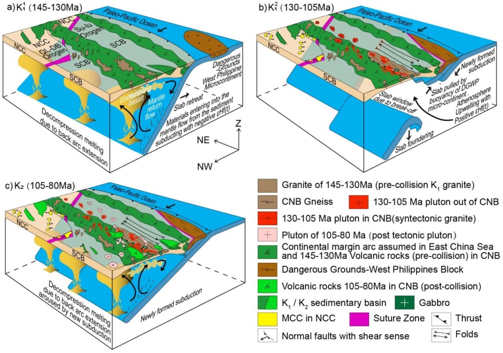 4)130-105 Ma的碰撞事件与华南岩浆平静期同步,而华南145-130 Ma和105-80 Ma的岩浆爆发与华南半地堑盆地、正断层、双峰式火山岩、A型花岗岩、岩墙群同时发育。由于西菲律宾陆块规模有限,古太平洋俯冲回卷后撤在华北并未受到碰撞事件的干扰,因而华北仍为拉张伸展体制,其间发生了岩浆爆发和克拉通破坏(图4)。研究认为岩浆平静期和挤压收缩体制有成因关系,而岩浆爆发和拉张伸展体制有关。