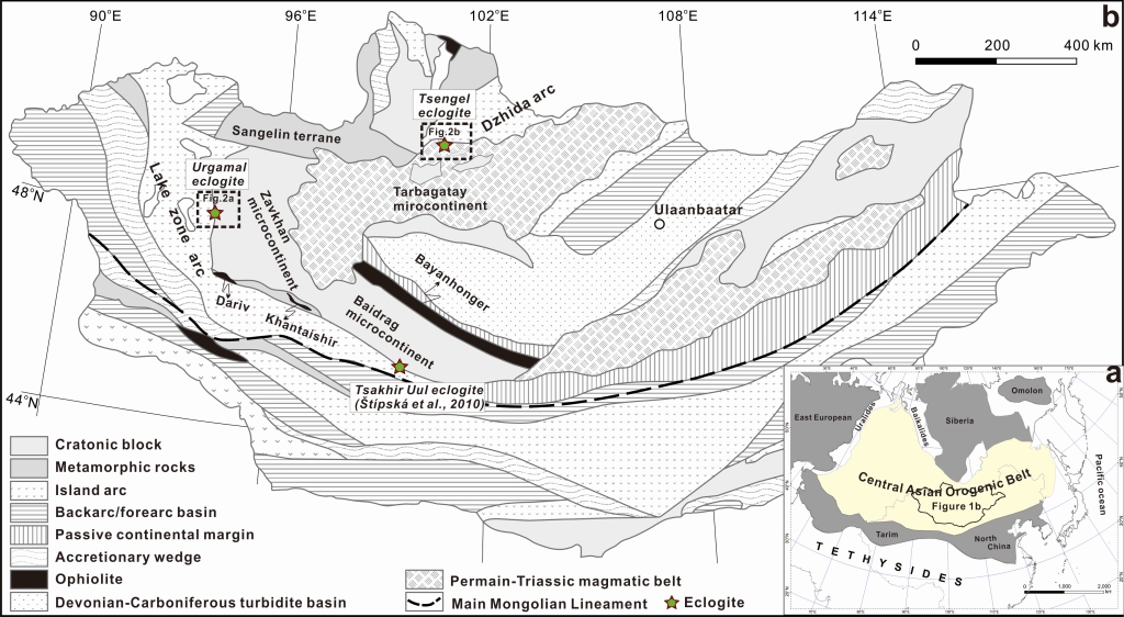 图1 蒙古地质简图及新发现的Urgamal榴辉岩和Tsengel榴辉岩位置